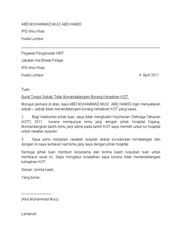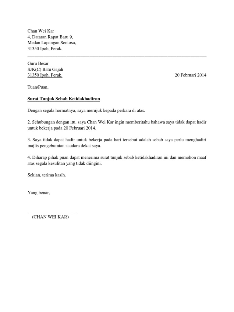 Surat Tunjuk Sebab Tidak Hadir Bekerja Kerana Kuarantin COVID-19. Contoh surat tidak hadir ke sekolah 1 sebab sakit ahmad khalid 1103 b lorong alor akar 33 25250 kuantan pahang. Panduan malaysia maklumat terkini contoh surat tunjuk sebab buat pekerja dan majikan.
