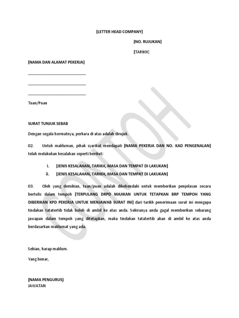 Bagi admin sebagai pegawai tenaga kerja. Contoh Surat Dari Majikan Tunjuk Sebab Di Atas Kecuaian Contoh surat. TuanPuan SURAT TUNJUK SEBAB KETIDAKHADIRAN KERJA.